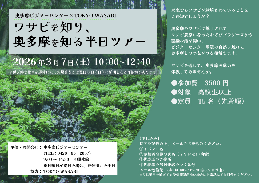 2026年3月7日(土)自然教室「ワサビを知り 、奥多摩を知る半日ツアー」